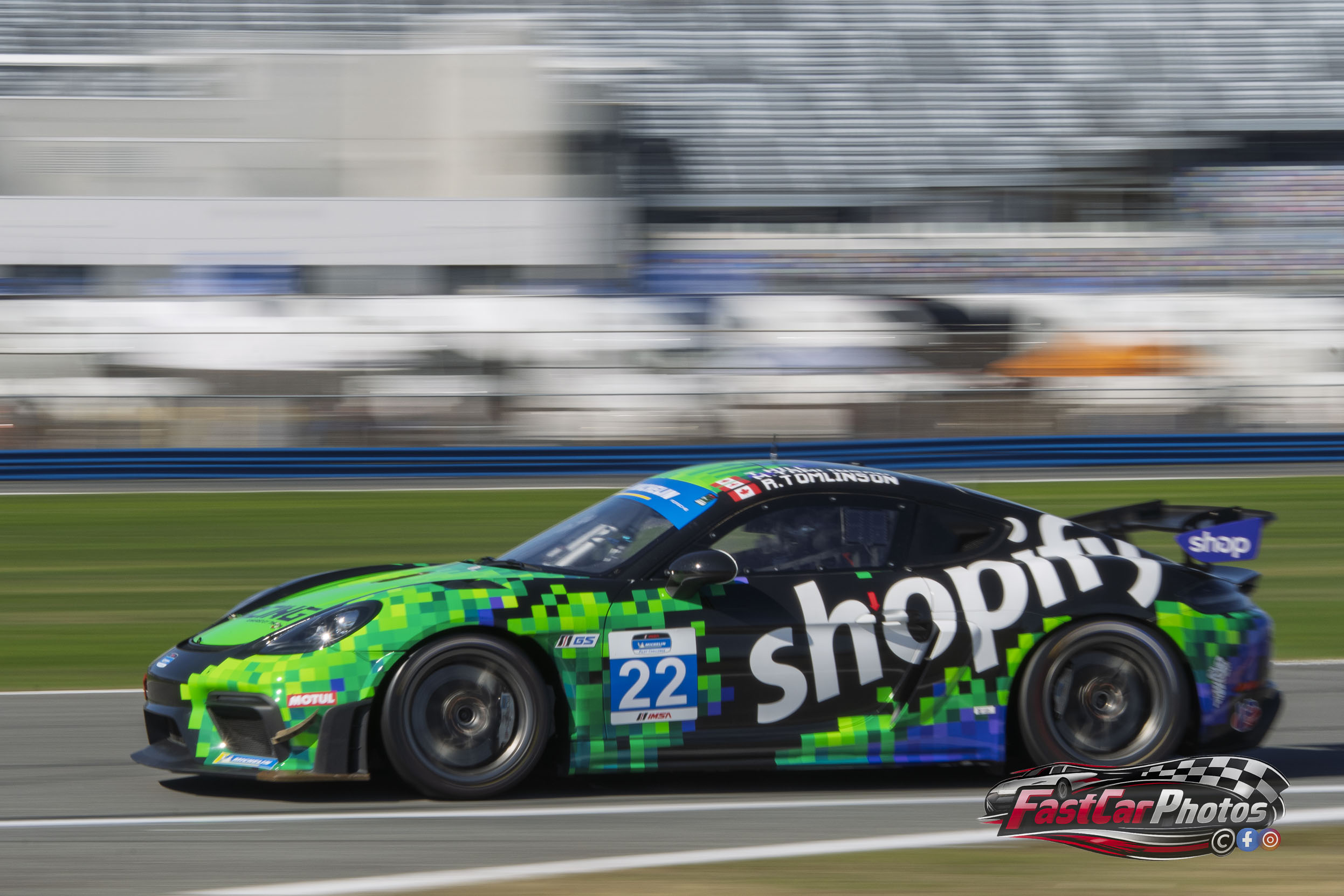 The team of TBD, Ron Tomlinson, and Megan Tomlinson in the Shopify Racing Porsche 718 GT4 RS CS at the 2026 Roar Before the Rolex 24 on January 16, 2026
